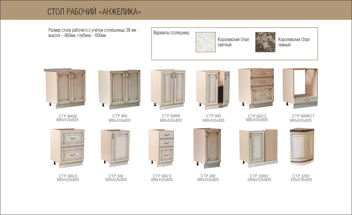 Комплектация столешницей 38 мм, цвет Королевский Опал Темный или Королевский Опал Светлый.
